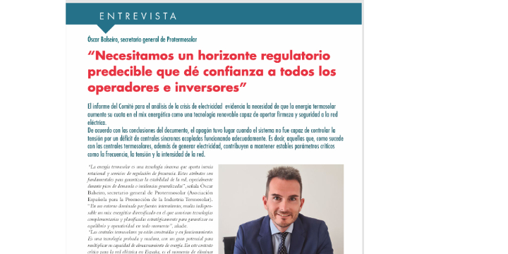 El secretario general de Protermosolar, Óscar Balseiro, ha analizado en una entrevista la importancia de la energía termosolar para reforzar la seguridad y estabilidad del sistema eléctrico español. A raíz del informe del Comité para el análisis de la crisis de electricidad, Balseiro destacó que la termosolar es la única renovable capaz de aportar simultáneamente generación síncrona, almacenamiento de larga duración y firmeza a la red. Asimismo, señaló la necesidad de eliminar los obstáculos administrativos que limitan su desarrollo y de avanzar en la construcción de nuevas plantas conforme a los objetivos del PNIEC.