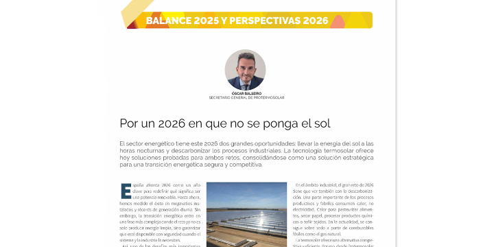 En la tribuna “Por un 2026 en que no se ponga el sol”, analizamos los dos grandes desafíos energéticos del próximo año: el aprovechamiento del almacenamiento térmico para generar electricidad sin sol y la sustitución de combustibles fósiles por calor renovable en la industria. El artículo aborda también la necesidad de un marco regulatorio adecuado, el refuerzo de la red eléctrica y el papel clave de la termosolar en la seguridad y competitividad del sistema energético.