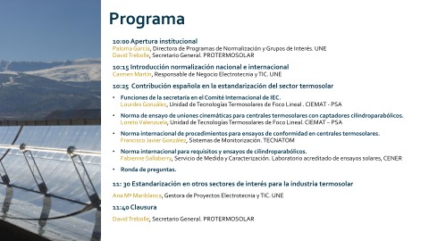 📢 Protermosolar, junto a UNE Asociación Española de Normalización y Plataforma Tecnológica SOLAR CONCENTRA, organizan el seminario “Normalización en el sector Termosolar. Oportunidades de posicionamiento industrial para España”. La apertura institucional correrá a cargo de Paloma Garcia, directora de Programas de Normalización y Grupos de Interés, junto a David Trebolle Trebolle, secretario general Protermosolar.
